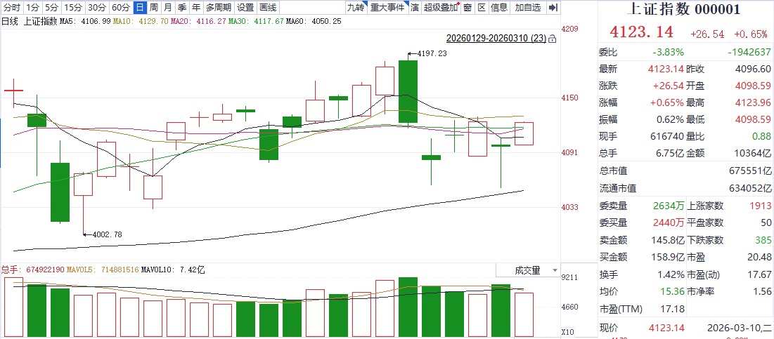 短期市场是否就此走好?对此,巨丰投顾高级投资顾问陈宇恒在接受金融投资报记者采访时表示:“中东局势可能缓和带动市场迎来阶段性回升,但成交量不增反减,在线炒股配资凸显出投资热情并未真正回暖,观望情绪依旧浓厚。究其原因,毕竟美伊冲突尚未平息,后续走势仍存在诸多不确定性,资金不敢盲目进场布局。从技术面分析,指数短期回升虽呈现双底雏形,但仍处于4197点以来的回撤趋势中,日线级别调整尚未结束,短期走势或仍有反复。若缺乏新的政策或事件催化,市场重心回落的趋势或将延续。”
