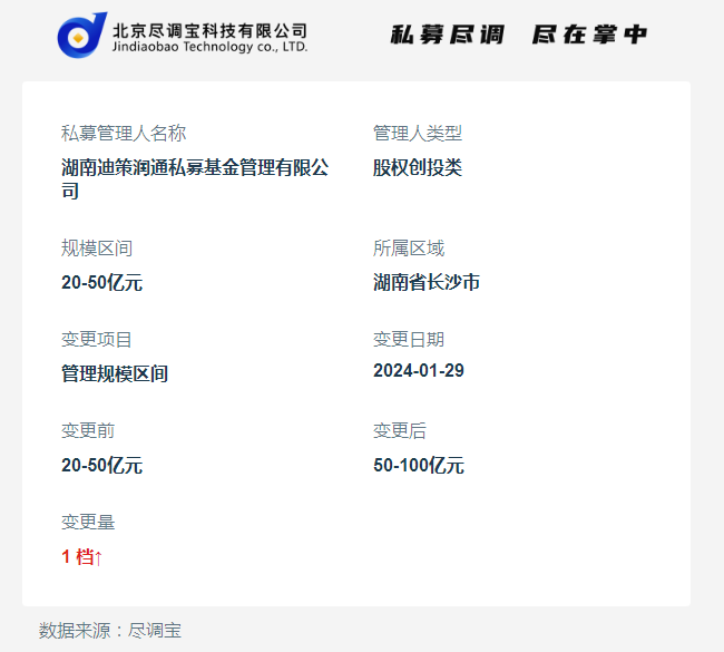 南方财经1月29日电,据尽调宝数据显示,1月29日湖南迪策润通私募基金管理有限公司管理规模区间发生调整,由原先的20-50亿元上调为50-100亿元。规模提升的原因可能是:由于管理人进行了季度更新,业绩提升。中基协登记信息显示,湖南迪策润通私募基金管理有限公司是一家私募股权、创业投资基金管理人,在线炒股配资成立于2016年05月26日,注册资本1.00亿元,其中实缴资本4000.00万元,管理规模产品区间为20-50亿元,实际控制人为华菱控股集团有限公司。