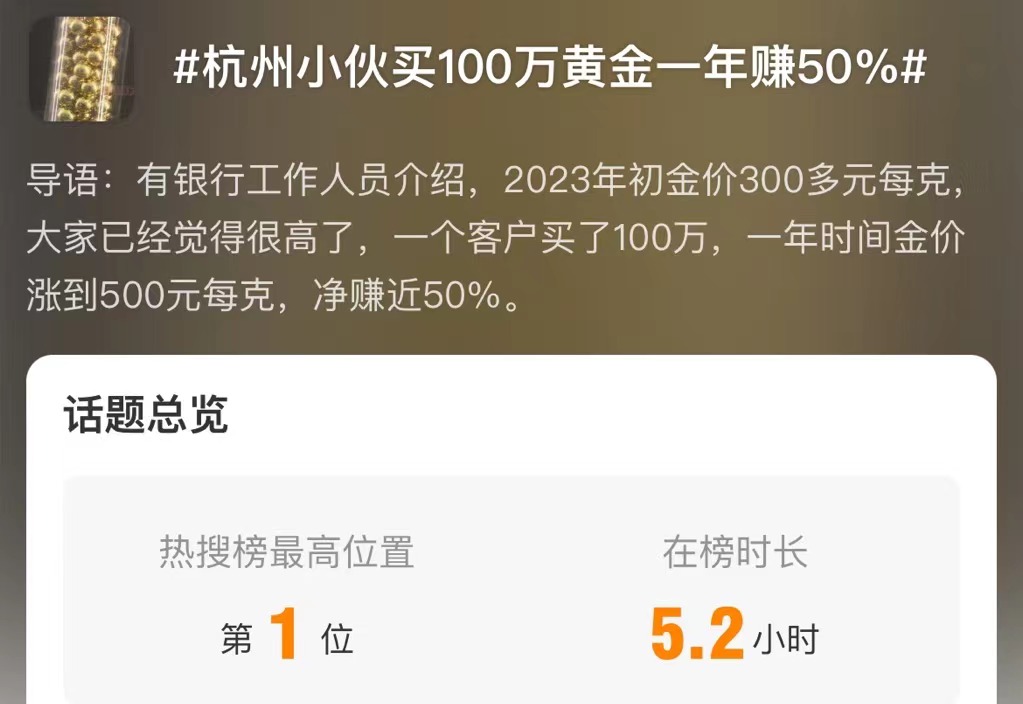 #杭州小伙买100万黄金一年赚50%#话题冲上微博热搜
