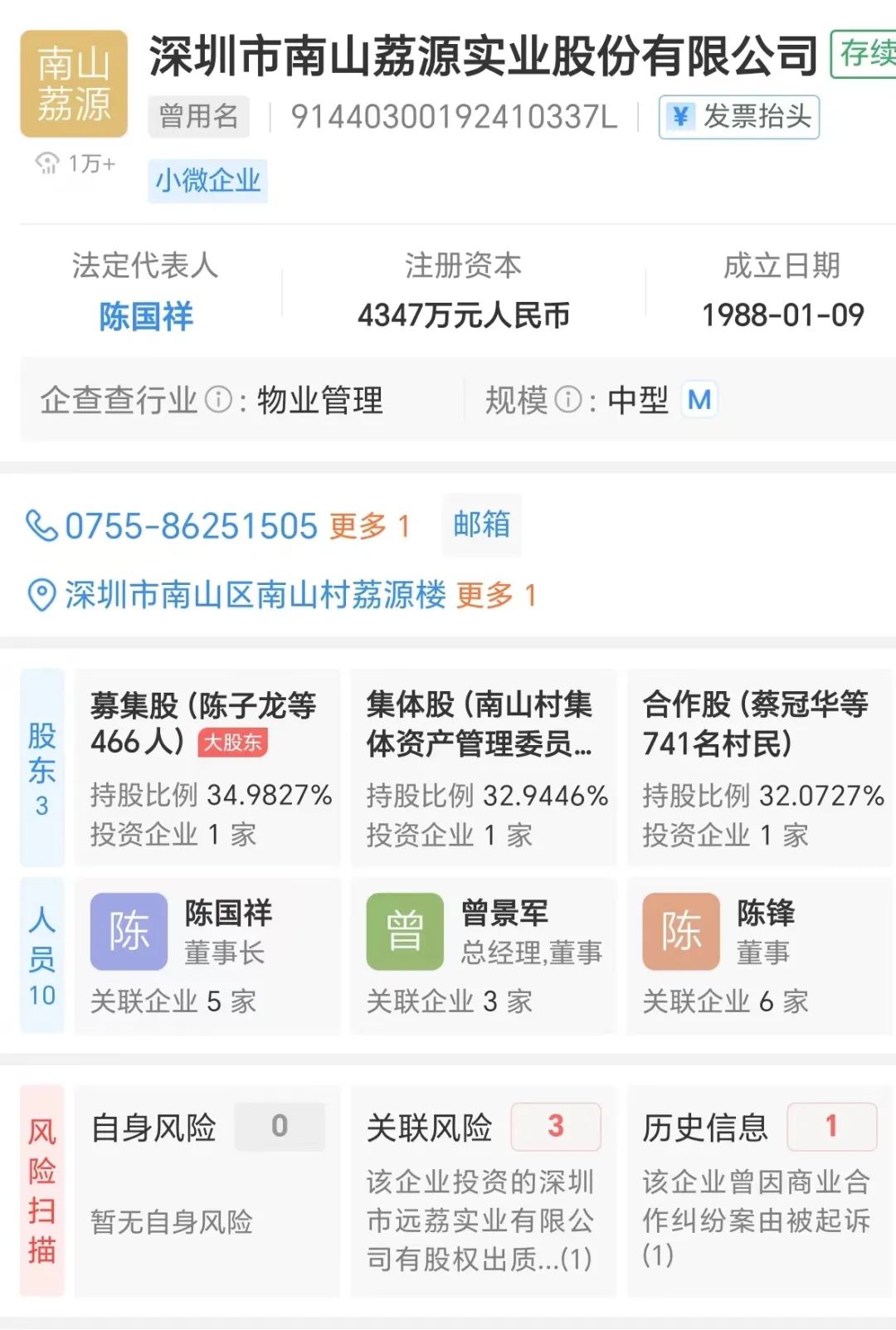 转让方为深圳市南山荔源实业股份有限公司,曾用名为深圳市南头区南山村企业公司,成立于1988年。企查查显示,该公司为当地村集体企业,股东人数众多,主要收益来源于土地转让、地租等,旗下有多家子公司。