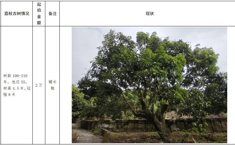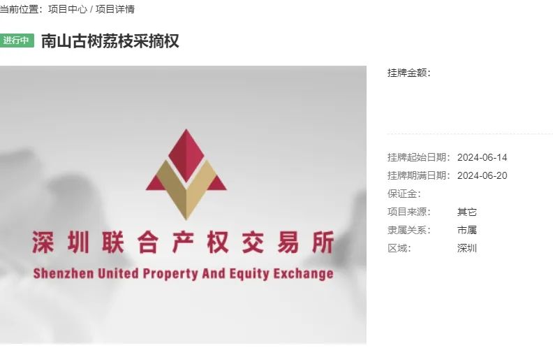 此外,深圳联交所还挂出一则公告——要招荔枝古树品牌守护商,价格为2000元/棵/年(3年合计6000元/棵),总共有58棵,都为百年以上荔枝树,成交方享有标的古树冠名权,可为古树命名。招商方为标的古树统一制作标牌,成交方可体验为荔枝古树施肥、浇水、除草、收获等。